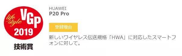 這次HUAWEI P20 Pro一舉摘得“日本VGP2019技術(shù)大獎(jiǎng)”,正因它是“適用于兼容新無(wú)線傳輸標(biāo)準(zhǔn)‘HWA’的智能手機(jī)”。