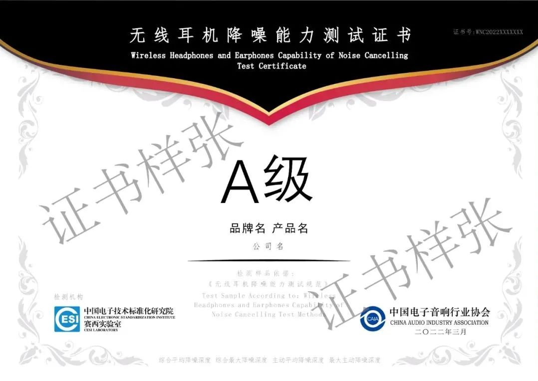 近日,首批參與“降噪耳機降噪性能集中評測”的所有產(chǎn)品已由中國電子技術(shù)標準化研究院賽西實驗室完成評測,測試方法依據(jù)T/CAIACN 006-2021《無線降噪耳機技術(shù)要求和測量方法》,各等級技術(shù)要求依據(jù)《無線耳機降噪能力測試規(guī)范》。