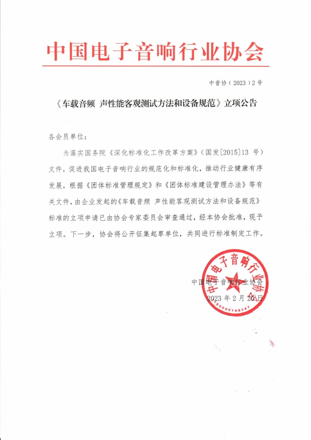 關(guān)于征集《車載音頻 聲性能客觀測試方法和設(shè)備規(guī)范》團(tuán)體標(biāo)準(zhǔn)起草單位的通知