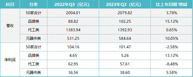 分類來看,品牌類與元器件類上市公司營收表現(xiàn)較好,同比營收增幅分別達到了15.12%和10.05%,4家品牌類上市公司凈利潤上升13.12%,33家元器件類上市公司凈利潤增幅達到了5.58%。代工類上市公司營收增幅約-8.48%