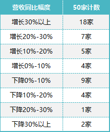 50家上市公司中有34家企業(yè)營收同比上升,增幅主要在30%以上。16家企業(yè)營收同比下降,降幅主要在0-20%之間。