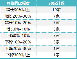 50家上市公司中有38家企業(yè)營(yíng)收同比上升,增幅主要在30%以上。12家企業(yè)營(yíng)收同比下降,降幅主要在0-10%之間。