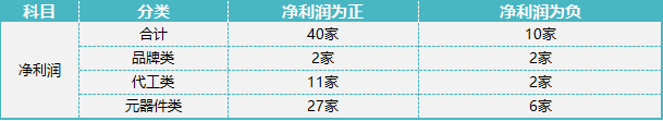 分類來看,品牌類與代工件類上市公司營(yíng)收表現(xiàn)較好,同比營(yíng)收增幅分別達(dá)到了27.86%和17.43%,13家代工類上市公司凈利潤(rùn)上升39.26%,33家元器件類上市公司凈利潤(rùn)增幅達(dá)到了33.42%。