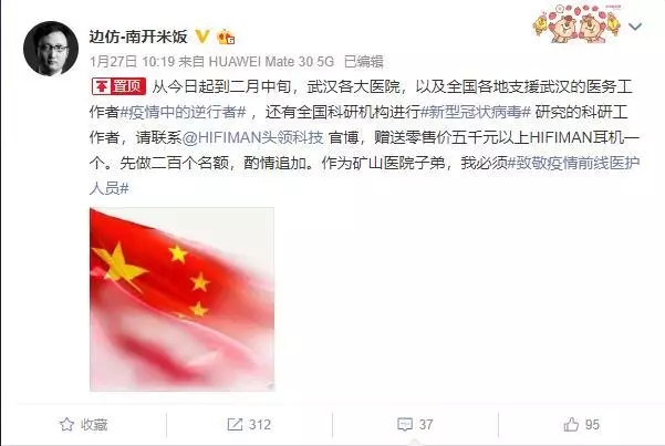 1月27日,HIFIMAN創(chuàng)始人邊仿在微博發(fā)布,至2月中旬,武漢各大醫(yī)院以及各地支援武漢的醫(yī)務(wù)工作者、病毒研究的科研工作者,可聯(lián)系HIFIMAN,獲贈(zèng)零售價(jià)5000元以上的HIFIMAN耳機(jī)。暫定200個(gè),后會(huì)酌情追加。