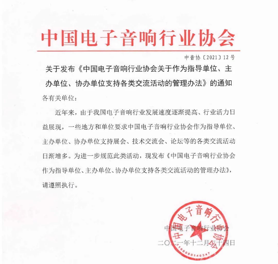 關(guān)于發(fā)布《中國(guó)電子音響行業(yè)協(xié)會(huì)關(guān)于作為指導(dǎo)單位、主辦單位、協(xié)辦單位支持各類交流活動(dòng)的管理辦法》的通知