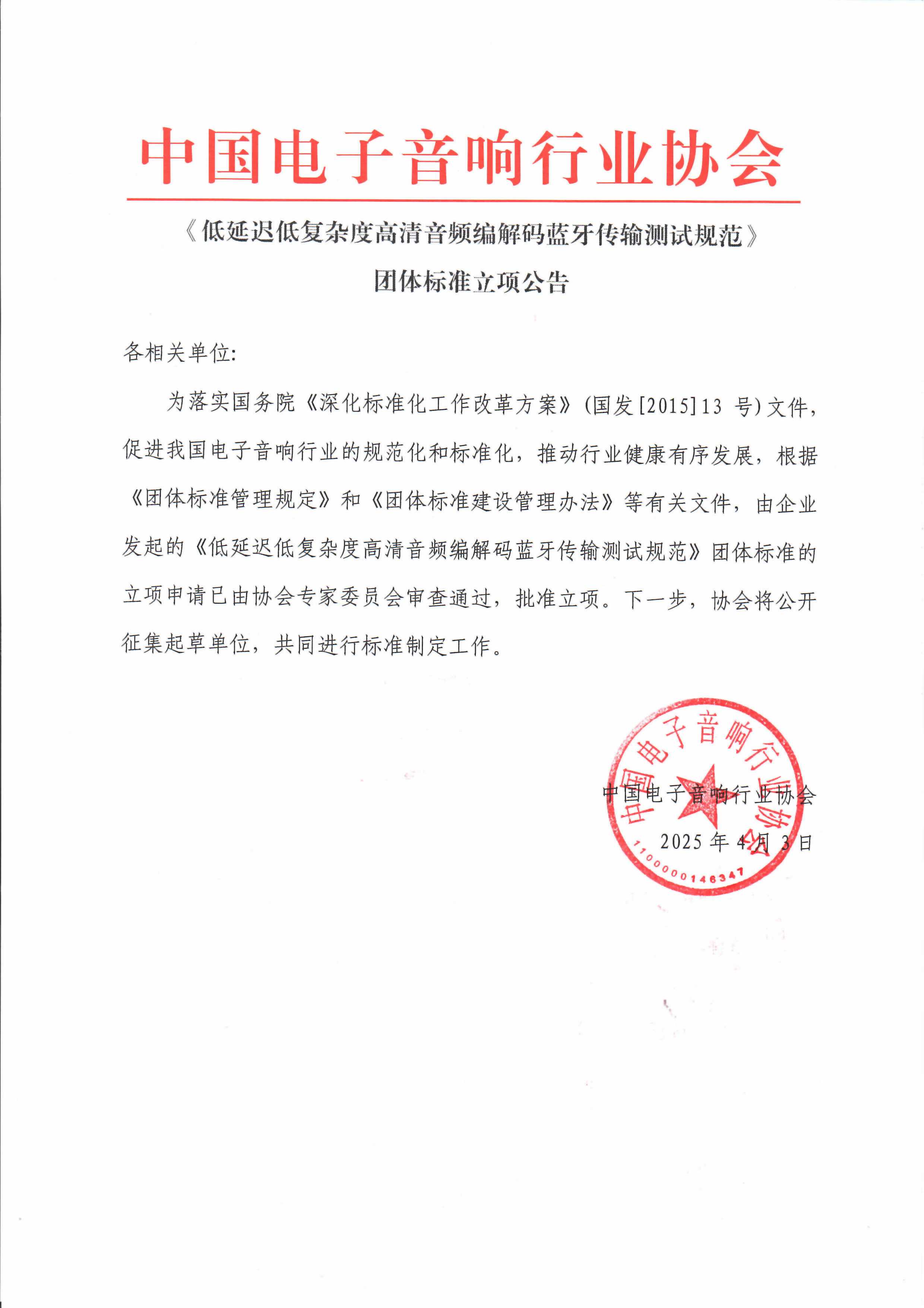 為落實國務(wù)院《深化標準化工作改革方案》(國發(fā)[2015]13號)文件,促進我國電子音響行業(yè)的規(guī)范化和標準化,推動行業(yè)健康有序發(fā)展,根據(jù)《團體標準管理規(guī)定》和《團體標準建設(shè)管理辦法》等有關(guān)文件,由企業(yè)發(fā)起的《低延遲低復雜度高清音頻編解碼藍牙傳輸測試規(guī)范》團體標準的立項申請已由協(xié)會專家委員會審查通過,批準立項。下一步,協(xié)會將公開征集起草單位,共同進行標準制定工作。