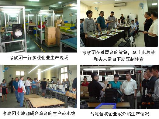 繼連續(xù)兩年的海峽兩岸音響同仁論壇順利召開后,應(yīng)臺(tái)灣音響行業(yè)代表的熱情邀請(qǐng),在臺(tái)灣音響協(xié)會(huì)的邀請(qǐng)和幫助下,由中國(guó)電子音響工業(yè)協(xié)會(huì)和花都電子行業(yè)協(xié)會(huì)牽頭組織的大陸電子音響企業(yè)考察團(tuán)于2013年6月16日抵達(dá)臺(tái)北,按照計(jì)劃對(duì)臺(tái)灣音響行業(yè)進(jìn)行了為期8天的考察活動(dòng)。