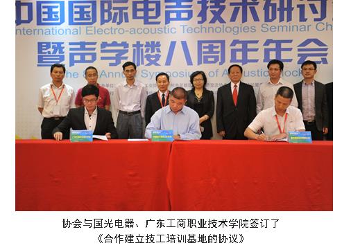 會(huì)上同時(shí)舉行了合作簽約儀式。協(xié)會(huì)與國(guó)光電器、廣東工商職業(yè)技術(shù)學(xué)院簽訂了《合作建立技工培訓(xùn)基地的協(xié)議》,旨在為至全國(guó)電子音響行業(yè)培訓(xùn)優(yōu)秀的技術(shù)工人;國(guó)光電器人力資源中心經(jīng)理譚鉆萍代表國(guó)光與中國(guó)海洋大學(xué)簽訂了《校企合作協(xié)議》,旨在加強(qiáng)校企合作,為國(guó)光培養(yǎng)高端技術(shù)人才,為學(xué)校學(xué)生創(chuàng)造實(shí)習(xí)機(jī)會(huì)。