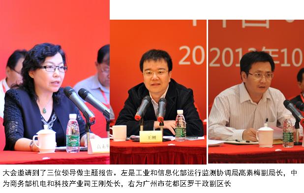 受八屆會長秦志尚委托,副會長張堅志致開幕辭,廣州市花都區(qū)羅干政副區(qū)長致歡迎辭。隨后,由工業(yè)和信息化部運行監(jiān)測協(xié)調(diào)局高素梅副局長、商務部機電和科技產(chǎn)業(yè)司王剛處長作主題報告。