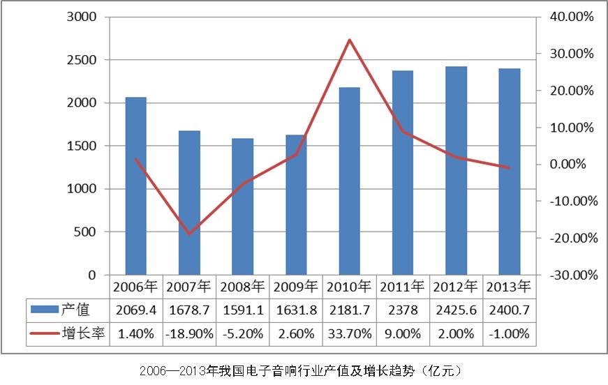 2013年,在中央“穩(wěn)中求進(jìn)”的經(jīng)濟(jì)工作總基調(diào)的積極作用下,在國(guó)家有關(guān)部門(mén)的具體指導(dǎo)下,我國(guó)電子音響產(chǎn)業(yè)穩(wěn)中求轉(zhuǎn),基本實(shí)現(xiàn)了夯實(shí)基礎(chǔ)、平穩(wěn)發(fā)展的目標(biāo),產(chǎn)業(yè)內(nèi)骨干企業(yè)加快轉(zhuǎn)變發(fā)展方式,不斷優(yōu)化產(chǎn)品與市場(chǎng)結(jié)構(gòu),全面深化轉(zhuǎn)型升級(jí),使得產(chǎn)業(yè)整體運(yùn)行呈現(xiàn)平穩(wěn)態(tài)勢(shì),生產(chǎn)保持穩(wěn)定,效益規(guī)模穩(wěn)步提升,結(jié)構(gòu)調(diào)整不斷加快,技術(shù)改造能力得到提高,產(chǎn)品結(jié)構(gòu)得到優(yōu)化,海外市場(chǎng)拓展取得一定進(jìn)展。