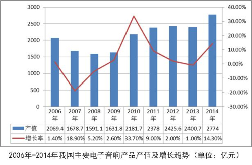 自1999年開始,我國主要電子音響產(chǎn)品產(chǎn)值以平均每年超過30%的增速上升,至2006年,產(chǎn)值已達2069.4億元。但是,受企業(yè)產(chǎn)能過剩、用工成本增加、原材料價格上漲、人民幣升值等因素綜合影響,我國主要電子音響產(chǎn)品產(chǎn)值增速從2006年開始放緩,并于2007年開始出現(xiàn)負增長。在企業(yè)還未完全消化上述不良因素時,2008年開始國際金融危機、歐債危機又席卷全球,產(chǎn)品出口面臨嚴峻形勢。2010年行業(yè)雖然實現(xiàn)恢復性增長,產(chǎn)值恢復到危機前水平,但隨著國際市場經(jīng)濟復蘇的低迷,行業(yè)總體處于低速調(diào)整期。2014年,由于國際市場的復蘇和我國居民收入增長較快、網(wǎng)絡零售保持旺盛,國內(nèi)國際市場均取得了良好的發(fā)展,行業(yè)消費熱點如通訊器材的配套音箱、耳機等產(chǎn)品繼續(xù)保持熱度,行業(yè)復蘇態(tài)勢明顯。