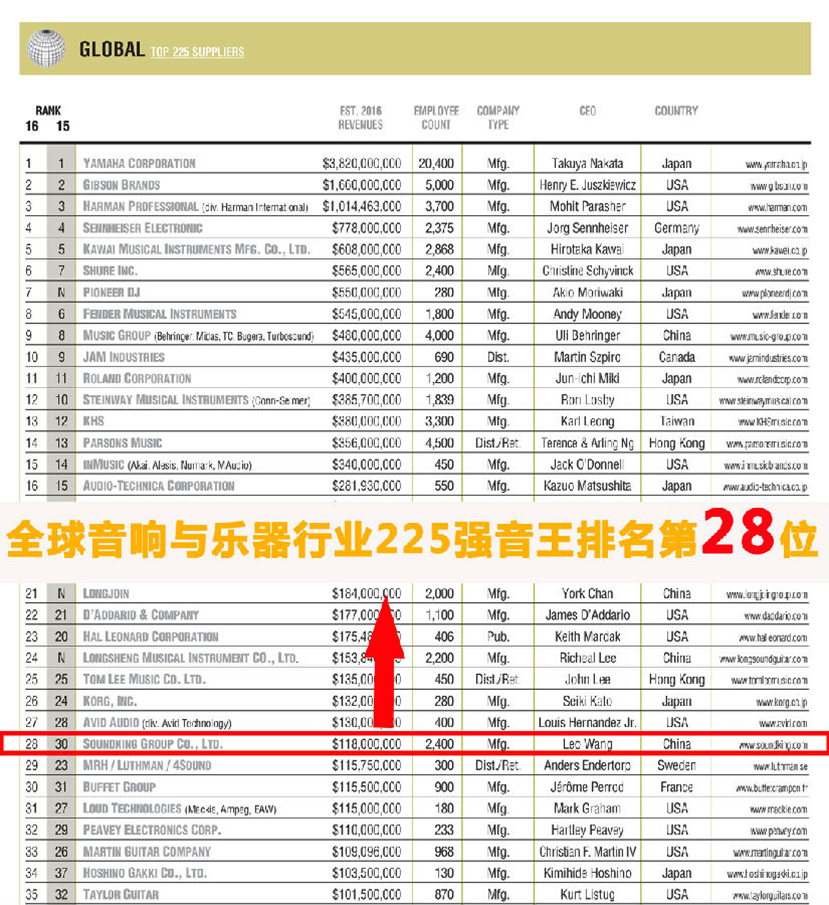 付出總會(huì)有回報(bào),2017年12月1日,國際權(quán)威雜志《Music Trades》公布了2017年全球音響與樂器行業(yè)225強(qiáng)榜單,音王集團(tuán)再次榮登行業(yè)珠峰,從去年的第30位上升至第28位。