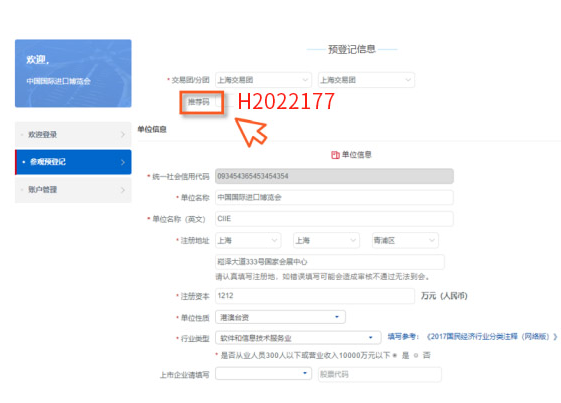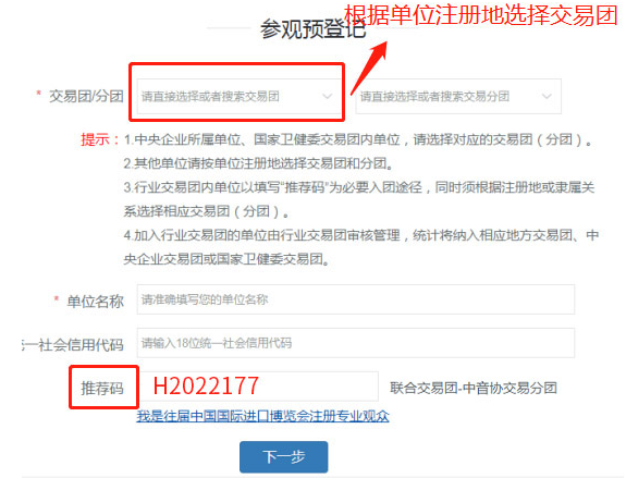 1、所有參會單位點(diǎn)擊邀請鏈接:登錄官網(wǎng)報名(網(wǎng)址:https://www.ciie.org/ciie/f/visitor/pre-book?iCode=H2022177&signature=B7980584344ECF2B44E1629C50FD16ED):在參觀預(yù)登記選項(xiàng)下進(jìn)行注冊;選擇“單位所在地區(qū)”,選擇單位及對應(yīng)的企業(yè)、社會組織、事業(yè)單位和政府機(jī)構(gòu)選項(xiàng);點(diǎn)擊新用戶注冊后輸入單位的“統(tǒng)一社會信用代碼”和中音協(xié)交易分團(tuán)邀請碼:H2022177