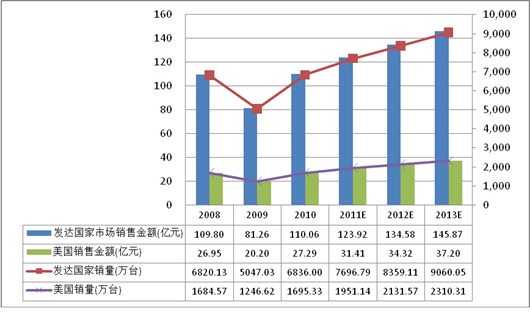 其中美國作為發(fā)達國家和地區(qū)中的關(guān)鍵市場之一,行業(yè)趨勢基本與發(fā)達國家持平。預計2011-2013年將銷量分別為1951.14萬臺、2131.57萬臺和2310.31萬臺,銷售額將分別達到31.41億元、34.32億元和37.20億元,年增長比例為10.7%。