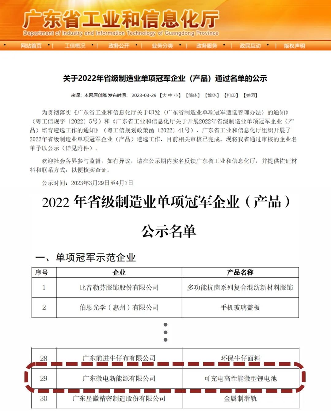 廣東省工業(yè)和信息化廳公示了2022年省級制造業(yè)單項冠軍企業(yè)(產品)通過名單,廣東微電憑借可充電高性能微型鋰電池產品,成功入選省級制造業(yè)單項冠軍示范企業(yè)。