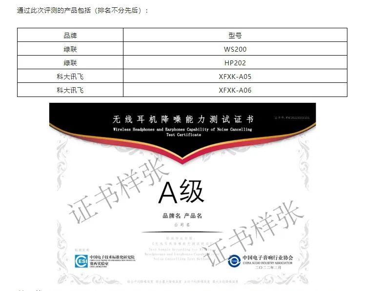 第五批獲得“無線耳機(jī)降噪能力測試證書”產(chǎn)品名單公布