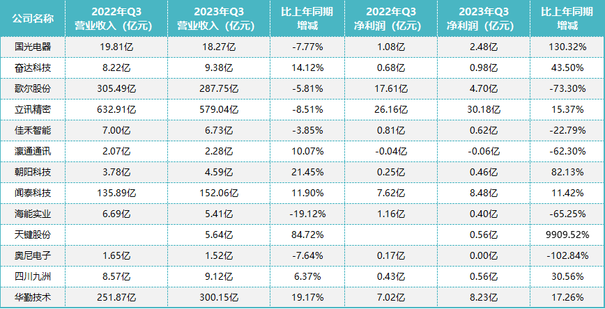 2023年三季度中國電子音響行業(yè)上市公司合計營收及凈利潤情況(數(shù)據(jù)來源:巨潮資訊網(wǎng) CAIA信息中心整理)