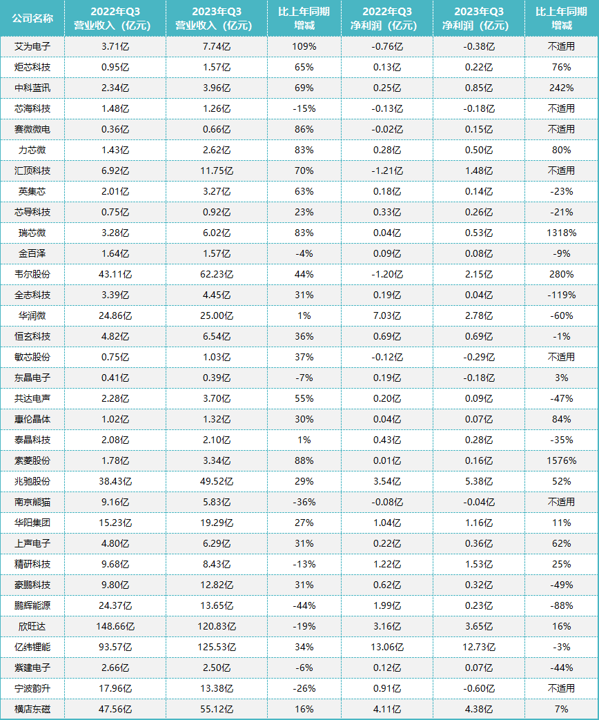 2023年三季度代工類上市公司營收與凈利情況及同比變化(數(shù)據(jù)來源:巨潮資訊網(wǎng) CAIA信息中心整理)