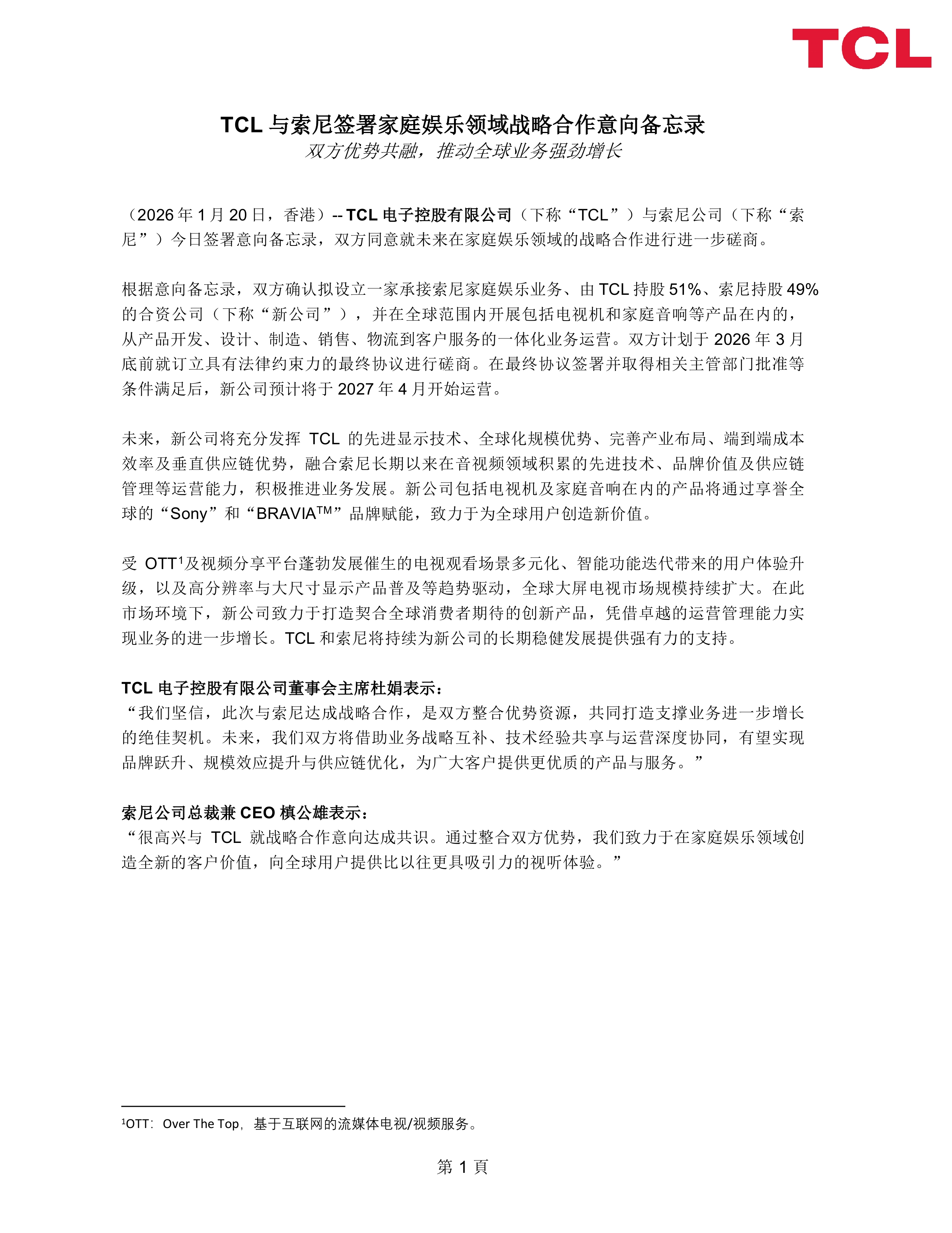 2026年1月20日,索尼公司與TCL電子同時(shí)發(fā)布公告,宣布雙方已簽署戰(zhàn)略合作意向備忘錄。核心內(nèi)容是計(jì)劃成立一家合資公司,以承接索尼旗下的家庭娛樂(lè)業(yè)務(wù)(主要包括電視機(jī)和家庭音響產(chǎn)品)。這并非一次簡(jiǎn)單的業(yè)務(wù)買(mǎi)賣(mài),而是涉及品牌、技術(shù)、供應(yīng)鏈與全球運(yùn)營(yíng)的深度戰(zhàn)略重組,標(biāo)志著全球電視產(chǎn)業(yè)競(jìng)爭(zhēng)格局可能迎來(lái)一次歷史性轉(zhuǎn)折。