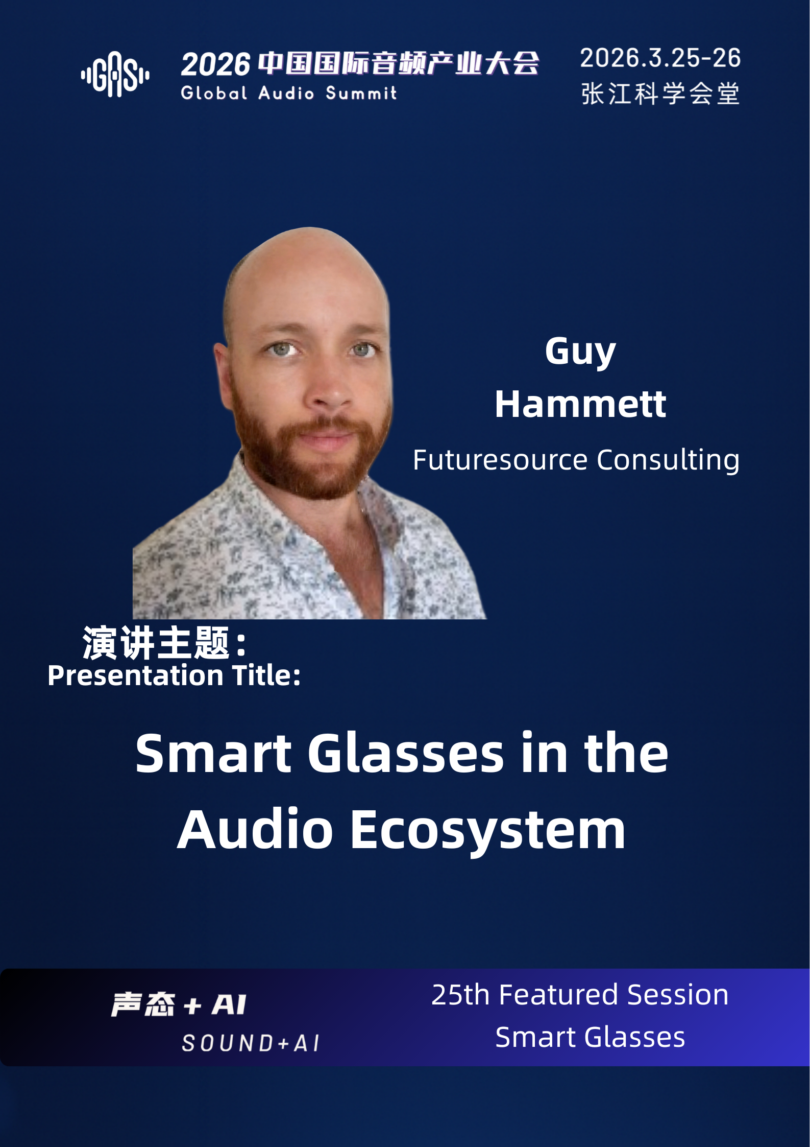 Futuresource 公司專家Guy Hammett 將基于數(shù)據(jù)洞察,剖析智能眼鏡在當(dāng)下音頻生態(tài)中的定位,以及該品類實現(xiàn)規(guī)模擴張所需的變革。本環(huán)節(jié)將依托未來源市場情報及宏觀音頻趨勢分析,穿透炒作迷霧,揭示市場接納動因、關(guān)鍵應(yīng)用場景、生態(tài)競爭格局,以及那些可能推動智能眼鏡從新奇玩物蛻變?yōu)榭纱┐饕纛l領(lǐng)域重要支柱的技術(shù)里程碑。