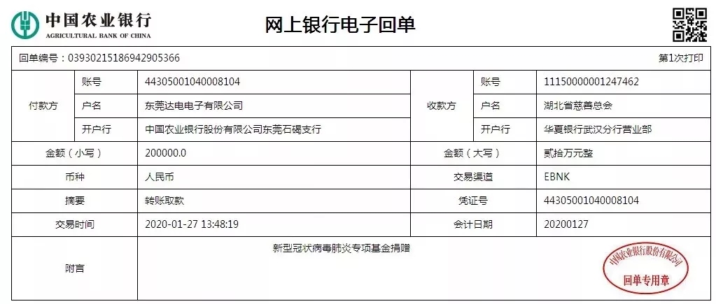 1月27日,達(dá)音科宣布向湖北省慈善總會(huì)捐贈(zèng)20萬(wàn)元,用于抗擊疫情。