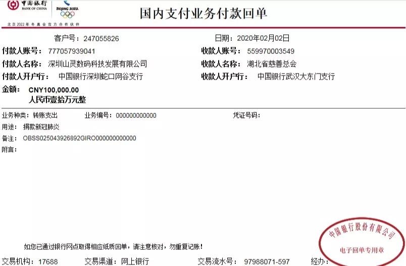 深圳山靈數(shù)碼科技發(fā)展有限公司向湖北慈善總會(huì)捐款人民幣十萬(wàn)元整,希望能盡綿薄之力支援這群最勇敢最偉大的一線戰(zhàn)疫人。