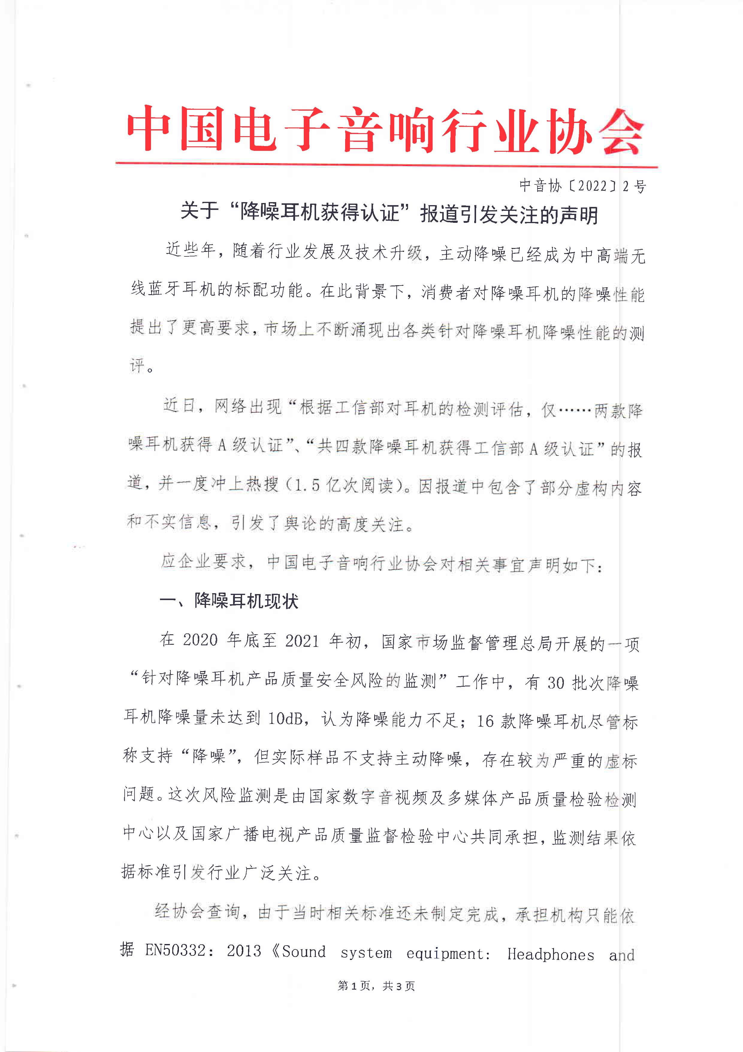 關(guān)于“降噪耳機(jī)獲得認(rèn)證”報道引發(fā)關(guān)注的聲明