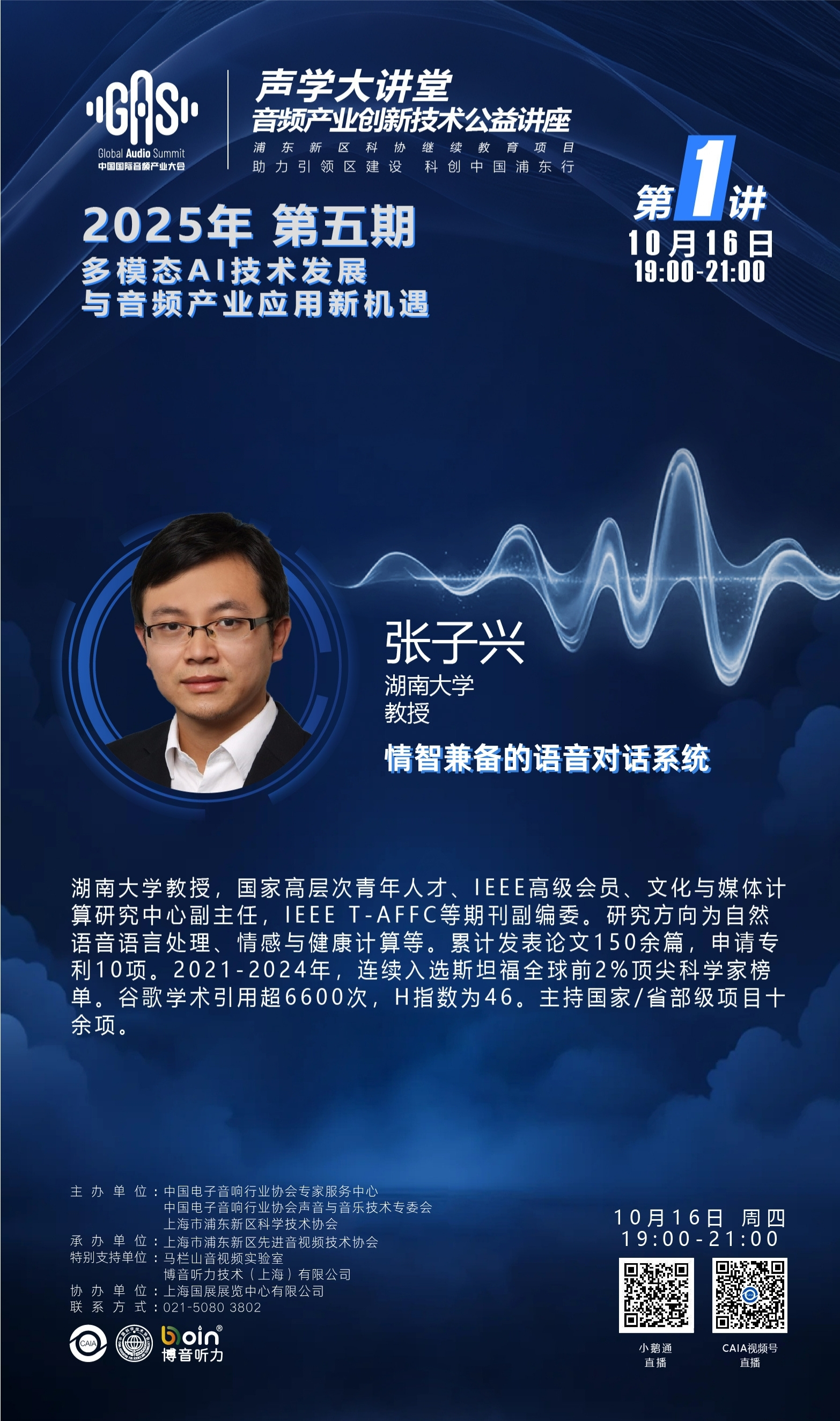 《2025GAS聲學(xué)大講堂—音頻產(chǎn)業(yè)創(chuàng)新技術(shù)公益講座》多模態(tài)AI技術(shù)發(fā)展與音頻產(chǎn)業(yè)應(yīng)用新機(jī)遇專題,講座第1講將于10月16日周四19點(diǎn)開講,本次邀請了湖南大學(xué)教授張子興演講,講座主題:《情智兼?zhèn)涞恼Z音對話系統(tǒng)》。此次直播方式為中國電子音響行業(yè)協(xié)會視頻號和小鵝通。感謝博音聽力技術(shù)(上海)有限公司對2025年聲學(xué)大講堂的支持。感謝馬欄山音視頻實(shí)驗(yàn)室對本期聲學(xué)大講堂的大力支持!