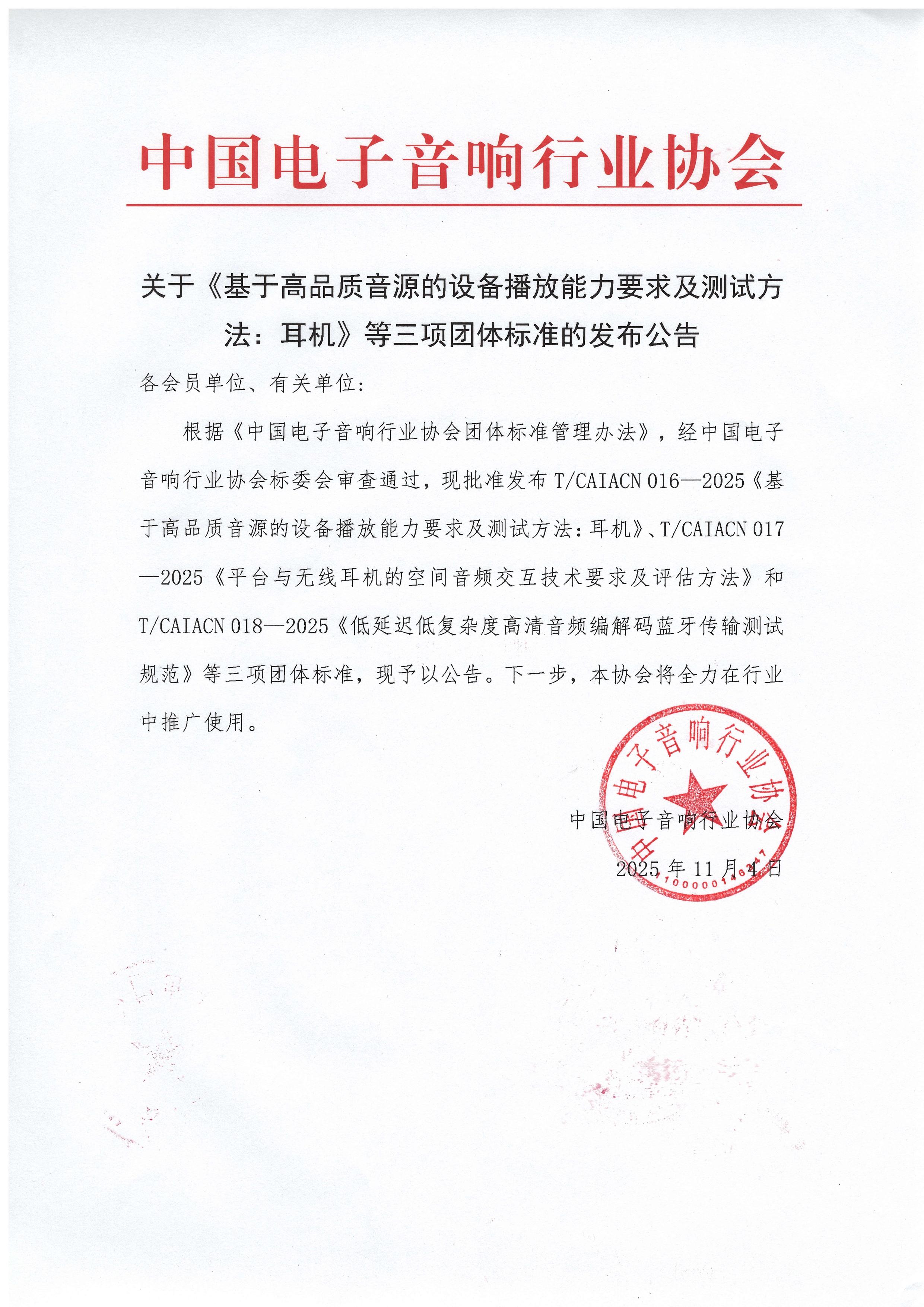 根據(jù)《中國電子音響行業(yè)協(xié)會團體標準管理辦法》,經(jīng)中國電子音響行業(yè)協(xié)會標委會審查通過,現(xiàn)批準發(fā)布T/CAIACN 016—2025《基于高品質(zhì)音源的設(shè)備播放能力要求及測試方法:耳機》、T/CAIACN 017—2025《平臺與無線耳機的空間音頻交互技術(shù)要求及評估方法》和T/CAIACN 018—2025《低延遲低復雜度高清音頻編解碼藍牙傳輸測試規(guī)范》等三項團體標準,現(xiàn)予以公告。下一步,本協(xié)會將全力在行業(yè)中推廣使用。